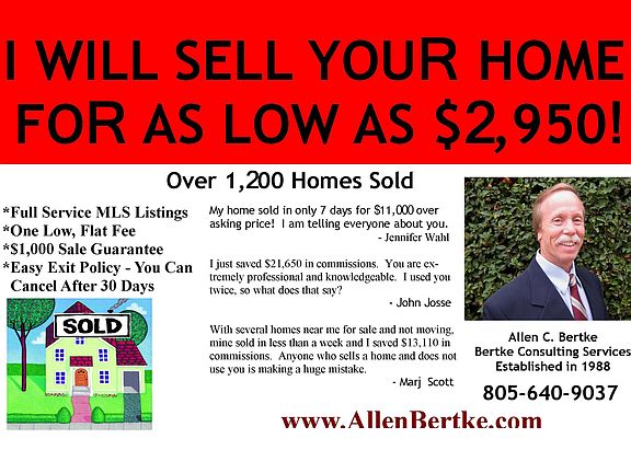 We Will Sell Your Home For A Commission As Low As $2,950! Ask Me About My $1,000 Guarantee! Why pay 5% or 6% commissions? Visit my website at AllenBertke.com, or call me at 805-640-9037 for more info about this property. Affordable home in south Oxnard. Close to schools, shopping, Mugu Naval Base and beaches. New exterior paint. Some dual pane windows. Fireplace. Tile floor in entry, kitchen and dining area. Inside laundry. Newer 6 panel ionterior doors. Updated hall bath. Attached 2 car garage. Added sunroom without permits has converted into separate workspace/storage area. Show and sell. One of the best ways to get as much for your property as you can is to pay less in commissions. Join the hundreds of sellers who have saved thousands of dollars by using my guaranteed Flat Fee Listing program. This is a full service listing for one flat fee as low as $2,950. The proven Flat Fee Listing Program, along with my 15 Point Marketing Plan, will give you an almost unfair marketing advantage over all others. Call me now at 805-640-9037 to learn more! Allen C. Bertke, Bertke Consulting Services, License #1064750
