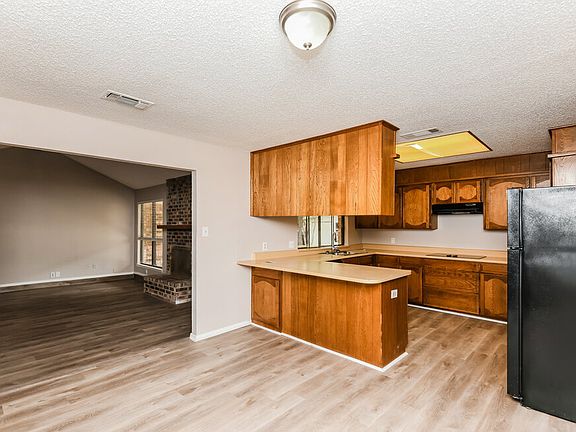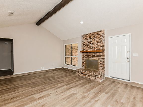 Located in the bustling city of Fort Worth, Texas, this single-story rental home offers over 1,400 square feet of space, including three bedrooms and two bathrooms. A large bricked fireplace serves as the focal point of the living room. An exposed ceiling beam centers the vaulted ceiling, and a white door leads out to the fenced backyard. In the kitchen, traditional wood cabinets offer adequate storage space for your dishes and cookware. Panel-covered ceiling lights provide illumination, and sleek black appliances add a classic flair. Adjacent to the kitchen is the cozy dining room. Tannish tile floors provide brightness and durability, and a large window lets in lots of sunlight. Apply for this home today!