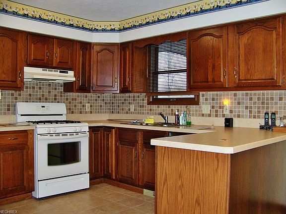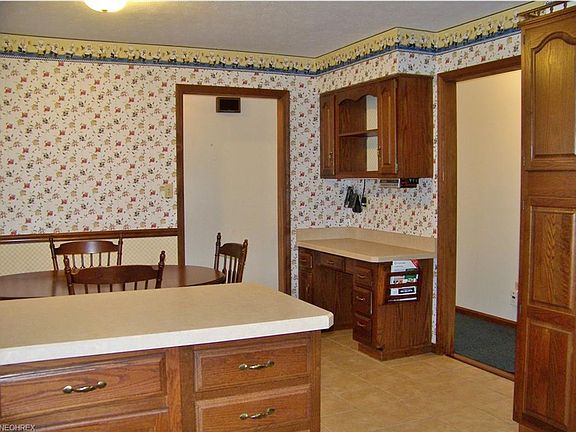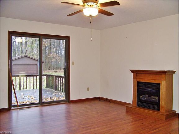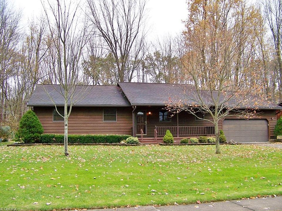 Ranch with full front porch. Great room, gas log, vent free fireplace, ceiling fan, slider to deck. Eat-in kit, oak cab, tile floor, plan desk, pantry, all kitchen appliances stay. Owner suite, walk-in closet, full bath w/sing sink van, shower. 1st floor laundry rm. Fin rec in lower level, nature stone floor, garage access. 2+ car attached garage w/nature stone floor. 2 car detached garage, concrete floor, electric, pull down attic stairs. Wooded lot.