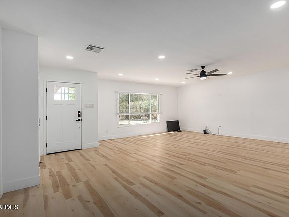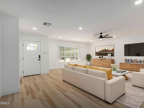 Beautifully remodeled 4 bed, 2 bath home in North Phoenix! Fresh exterior paint inside & out. Amazing open concept living w/ wood like flooring throughout - no carpet! Stunning chef's kitchen features quartz counters, two toned shaker cabinets w/ brushed gold accents, blue subway tile backsplash, and SS appliances. Kitchen island includes an undermount sink w/ extra storage, bar stool seating and pendant lighting. Primary suite features a large walk-in closet, sliding glass door for lots of natural light & exterior access, en-suite bathroom with oversized walk-in shower, beautiful tile, soaking tub, and dual vanity. RV gate & RV Parking! Enjoy AZ days outside with sparkling pool, covered patio & spacious backyard w/ lush green landscape. Close to i17 freeway, ASU West campus, Banner Thunderbird medical hospital, & dining.