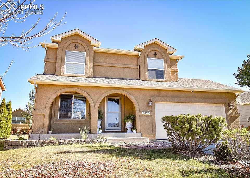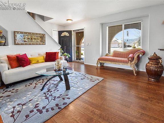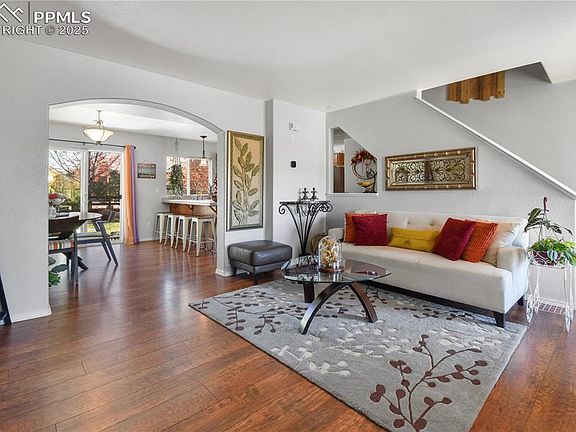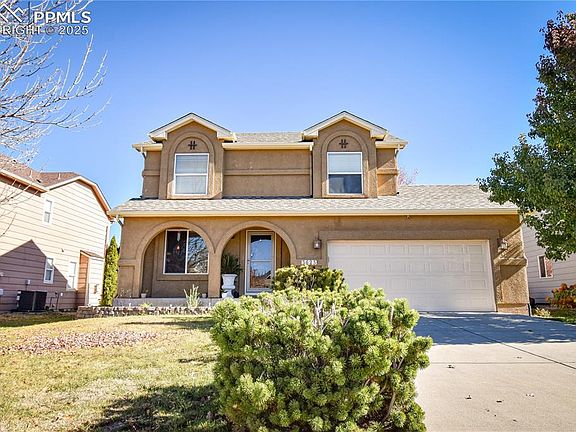 Welcome to this beautiful 4-bedroom, 3-bath home, boasting stunning views of Pikes Peak and the surrounding mountains. The bright main level features gleaming hardwood floors, soaring vaulted ceilings, and a modern kitchen with stainless steel appliances and a breakfast bar that flows into the dining area and out to your patio and landscaped backyard sanctuary. Enjoy the gas fireplace while soaking in mountain panoramas, or head downstairs to the finished lower level with its adaptable bedroom/office space, large family room, and full bathroom featuring luxury vinyl plank flooring. The primary suite upstairs offers a peaceful haven with soaking tub, dual vanities, and generous closet space, complemented by two more comfortable bedrooms and a full bath. Conveniently situated minutes from Fort Carson, Peterson SFB, and Schriever SFB. This turnkey home awaits!