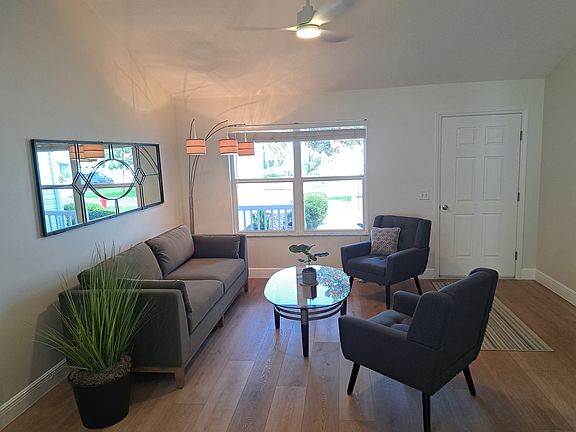Bright updated kitchen with new quartz countertops, all brand new appliances including a gas stove, microwave, dishwasher and refrigerator. There is a dedicated filtered drinking water faucet on the countertop. The master bedroom with en-suite bath has a king size bed, a large walk-in closet and a sliding patio door onto the screened lanai. The guest bedroom has a king size bed and closet. The 3rd bedroom is set up as a den/office. The indoor laundry room has a washer and dryer. An enclosed lanai is set up with comfortable chairs. The covered screened lanai features a round dining table with 4 chairs. The front covered porch is great for morning coffee. This gorgeous home, located in a quiet neighborhood, comes with a 2 person golf cart.