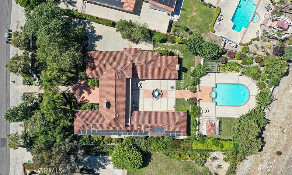 Inside, the house boasts six bedrooms and five baths, all very spacious. Vaulted ceilings, ample natural light through custom windows, a family room fireplace, a gourmet kitchen, separate dining and living rooms, wood flooring, and a classic glass chandelier enhance the interior. Practical amenities include a four-car garage, fully paid-for solar panels, high-end security with a camera monitoring system, and more.