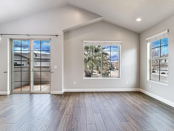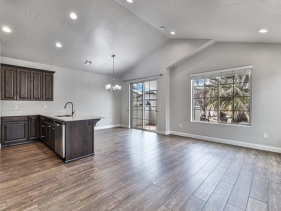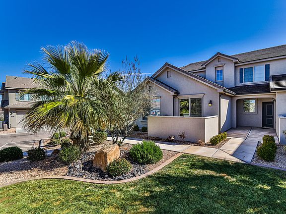 Huge, move-in-ready end-unit townhome with main floor master. This home has been well cared for and is in pristine condition. Home has a coveted 3.5 baths & all bedrooms are ensuite with their own FULL bath! Vaulted ceilings in great room. Elegant kitchen has both a warm feel & modern design. Dishwasher is new within the last year! Upgraded storage cabinets in the garage! Family room gazes out onto a LARGE section of beautifully landscaped common area, which gives the residence more privacy than neighboring homes! Unit has excellent orientation, helping it stay cool in the summers! HOA includes all exterior yardwork, access to community pool, hot tub, & lounge area. Nearby Hidden Valley Park is one of the top parks in St George w/ a splashpad, massive playground, tennis, volleyball & more The home is located in the beautiful & serene Villa Highlands at Hidden Valley and is a perfect lock and go! Come schedule your appointment today!