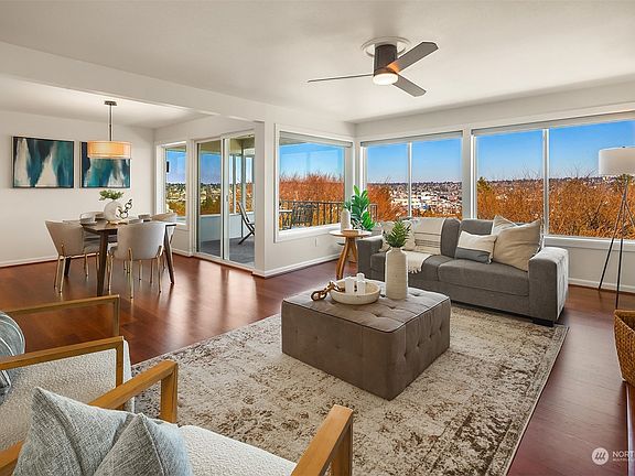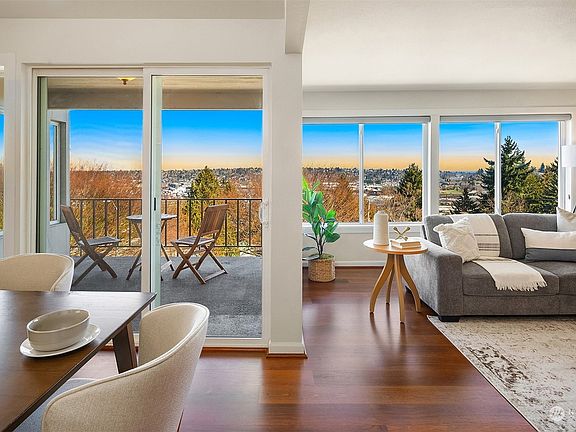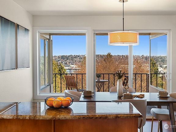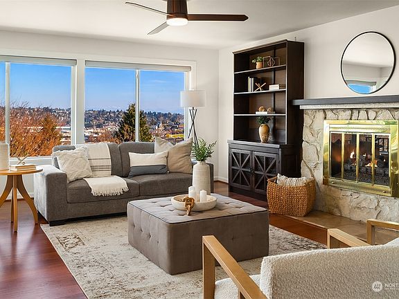 Spectacular Cascade Mountain views highlight this extraordinary top floor condo. Wake up to majestic sunrises and spend sunny days on your private balcony watching the city views. Relax in front of your fireplace in the evening in this exceptionally beautiful home. Totally updated in 2007 with spacious, open floor plan with chef's kitchen connecting to the dining room. Large primary suite with more views & 2 more bedrooms. Stunning, expansive windows fill these rooms with natural light. Freshly painted, new hot water heater, secure building with just 2 other units. Designated garage space plus room for 2 more cars in driveway. Pool, clubhouse & fitness room. Affordable HOA dues. Close to Fisherman’s Terminal, Discovery Park, bus transit.