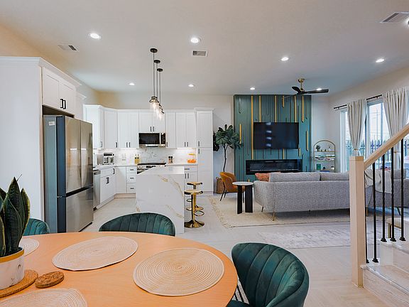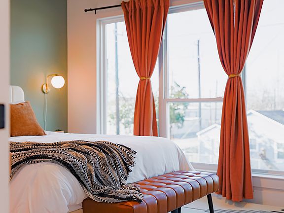 Inside, the home is designed to feel both elevated and comfortable. The living room invites you to unwind -- with cozy seating, blackout curtains, a bold feature wall, and an electric fireplace for added ambiance. By day it's full of natural light; by night, it transforms into a private, peaceful space.