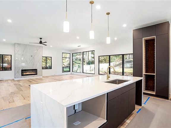 Property Highlights: Secluded Cul-de-sac. Sleek two-car garage finished with durable, showroom-style epoxy flooring. Expansive 5-bedroom, 4-bath residence offering approximately 3,610 square feet of thoughtfully designed living space. Dramatic floor-to-ceiling 8-foot windows flood the home with natural light. Entertain in style around the stunning 9-foot waterfall kitchen island, the true centerpiece of the home. Seamless indoor-outdoor living through an impressive 8-foot sliding glass door. A one-of-a-kind backyard bridge leading to your own private oasis-a serene retreat perfect for relaxing or entertaining under the stars, with two connecting, natural streams that create a peaceful and restful sound to your ears. Two fireplaces, anchoring both the living area and primary suite with warmth and ambiance. Designer two-toned Euro-style cabinetry featuring polished and matte high-gloss finishes. Soaring 10-foot ceilings create an open, airy feel throughout. Contemporary floating vanities with elegant under-vanity lighting. Premium solid-core interior doors for enhanced privacy and sound control. Energy-efficient LED lighting throughout the home. Dedicated laundry room for everyday convenience. Statement-making luxury light fixtures elevate each space. Spa-inspired primary bath with a 5-foot freestanding soaking tub. Dual shower controls with indulgent overhead rain shower faucets. Spacious walk-in primary closet designed for modern living. Built-in wine storage, perfect for collectors and entertainers alike Location & Lifestyle: Direct access to over 400 acres of green space, trails, and outdoor recreation. Zoned for highly regarded Sarah Smith Elementary School. Exceptional walkability and bikeability, ideal for an active lifestyle. Moments from iconic dining, including Hal's Steakhouse, shopping, and entertainment.