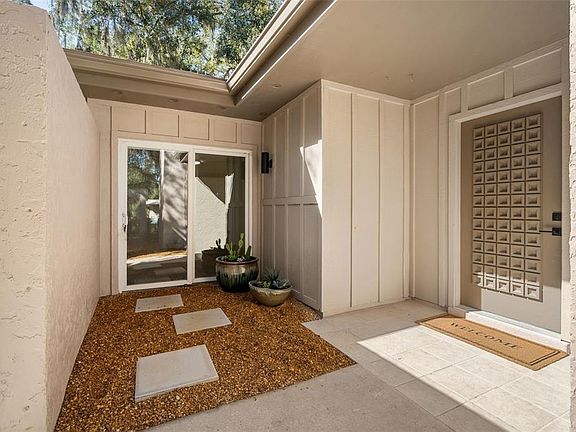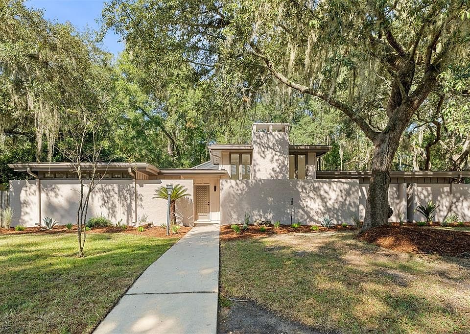 Looking for a mid-century modern pool home under $450,000?You found it! This gut- remodeled home boasts over $100,000 in upgrades including a completely refinished pool, brand-new water heater, and all-new kitchen, baths, floors and paint (all 2025) as well as an updated roof (2022), and HVAC (2019),! What you’re about to experience is a work of art. As you approach, you’ll notice the home is framed by majestic oak trees, with a freshly painted exterior and lush Florida landscaping. The driveway leads to an oversized one-car garage, with plenty of room for vehicles and storage. Designed in a striking U-shape, wrapped around a shimmering pool at its center, visible from nearly every room by way of 6 sets of sliding glass doors. Step through the private courtyard and ornate front door, and light pours in through walls of glass, blurring the line between inside and out. To your right, a sunken living room, a nod to the retro conversation pit, commands attention with its bold wood-burning fireplace. Turn the corner and the open dining and kitchen area stirs both nostalgia and sophistication. In the kitchen, rich walnut dark wood cabinetry contrasts brightly with quartz countertops, while a green tile backsplash ties the palette together. Bespoke stainless steel appliances and a sleek peninsula bar complete this stunning culinary space. French doors open to a bonus room ideal for an office, studio, or private retreat, with its own backyard access. A generous utility closet discreetly hides the washer/dryer station and abundant storage, with a door leading to the garage. The hallways are a mood, with hidden lighting that lead you into the private wing. The primary suite offers privacy with a view and direct pool access, a spacious walk-in closet, and a one-of-a-kind bath: sleek dual vanity, bold black hardware, and pink porcelain tile that flows from the floor into the sunken bath and all the way to the ceiling. The guest bath is equally stylish, with terrazzo tile floors and funky textured tile wrapping the tub-shower combo. Two guest bedrooms feature soft carpeting and transom windows that fill the rooms with natural light. At the center of it all, the freshly re-marcited pool glistens beneath its screened enclosure, an irresistible focal point for both daily living and entertaining. Nestled in the private neighborhood of Hidden Oaks, offering serene, tree-lined streets while remaining just minutes from top schools, dining, and city conveniences.