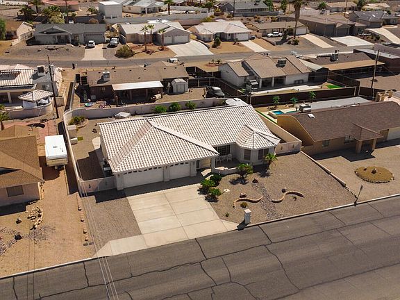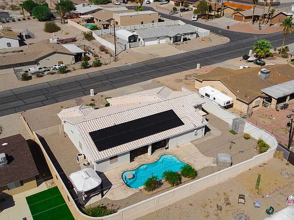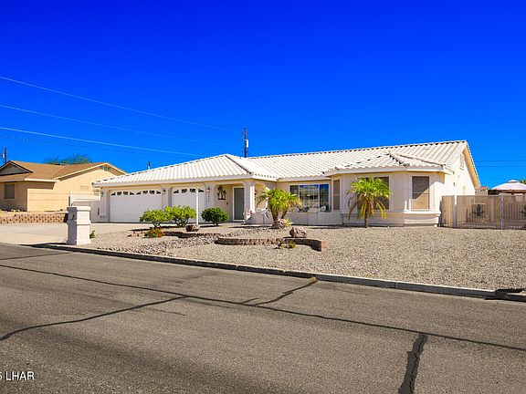 Hard-to-find 4-bedroom, 2-bath pool home that perfectly blends comfort, style, and Havasu fun! This 2003 built 1,962 sqft home has been lovingly cared for by its second owner. Currently used as a part-time short-term rental and vacation getaway, it's ideal for large families or entertaining guests! The popular split floor plan offers the primary suite on one side and 3 guest bedrooms on the other. The master bath features dual vanity sinks and a beautiful tile walk-in shower. The kitchen shines with tile counters, tile backsplash, and convenient pull-out drawers in the lower cabinets. Step outside to your own backyard retreat with a sparkling gunite pool (electric heated) featuring elegant spill pots, plus an electric hot tub for year-round relaxation—and a handy outdoor toilet for pool days! Energy-efficient perks include a full solar system (paid in full at closing) and a new 17 Seer split heat pump installed in Dec 2024. The 3-car garage offers a 29' boat-deep bay with mini-split AC, plus side parking on both sides! This home is as beautiful as it looks, beautifully maintained and full of Havasu charm!