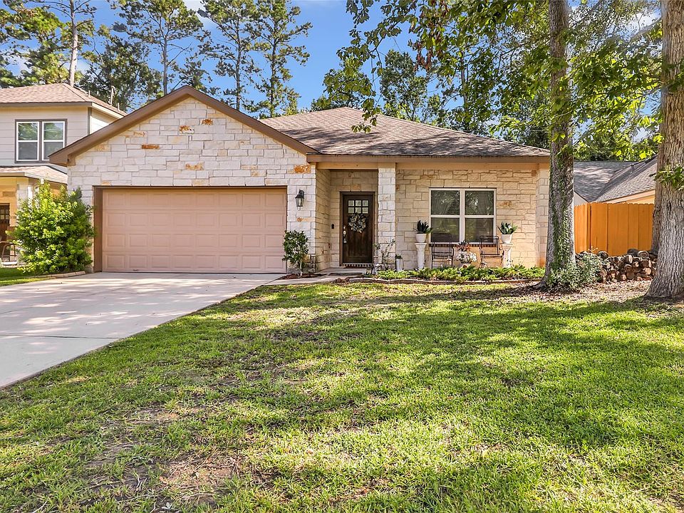 Welcome to Kennington Ct. nestled in the lake side community of Huffman! This property is located on a quiet cul-de-sac street with no back neighbors. Plenty of curb appeal with beautiful stone exterior, an inviting front porch, and a custom front door. Upon entering the home you will notice the high ceilings and an open concept floorplan. This is a split floorplan with three bedrooms located towards the front of the home. The massive primary suite with its own private bathroom is located at the rear of the home. The primary suite has a tranquil view of the backyard woods. This suite also boasts of an enormous walk in closet and a separate linen closet. The kitchen is the heart of this home with a soaring ceiling, plenty of cabinet storage, and vast countertops. An open bar leads into the living room and breakfast nook. Through the breakfast nook is a covered patio and private backyard. This home is cozy, spacious, and ready for a new owner! schedule today!