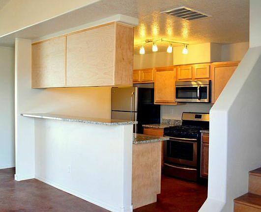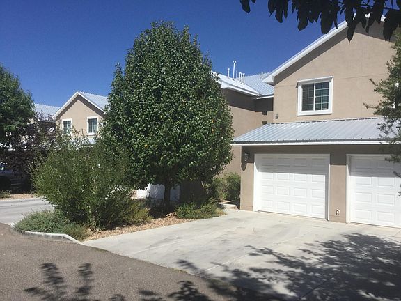 Gorgeous quiet community in the Rio Grande Valley. Northern New Mexico- style townhouse with pitched metal roof. 2 LARGE bedrooms upstairs with walk-in closet; vaulted ceilings, and hardwood laminate floors. Full bath upstairs with ceramic tiles and double vanity. 1/2 bathroom downstairs; linen closet; kitchen opens to the living area and has beautiful tile countertops with breakfast bar, walk-in pantry, and all stainless-steel, Energy-Star appliances (5-burner gas range, microwave, dishwasher and refrigerator). Washer/dryer included. Downstairs floors are a beautiful stained concrete. Other amenities include large enclosed private backyard with patio, fully landscaped front and back; fruit trees, and attached 1-car garage. Located close to I-25 and I-40, Downtown, Old Town, UNM, great shopping and dining, and the Rio Grande Nature Center. Minimum 1-year lease.