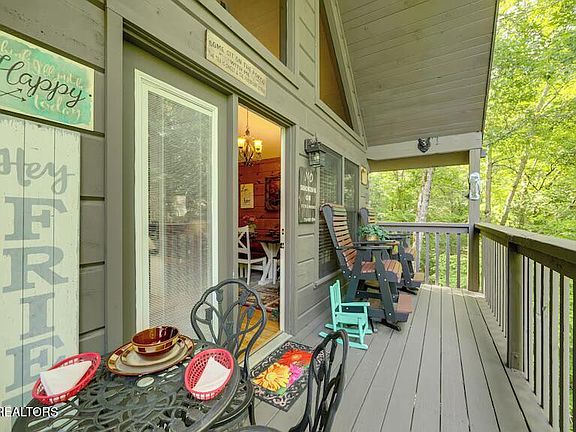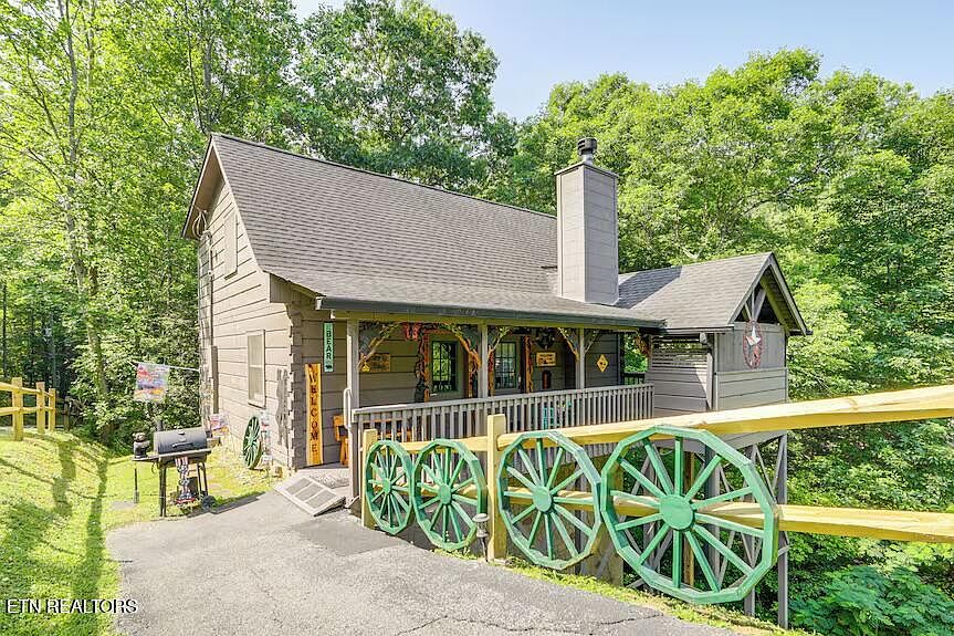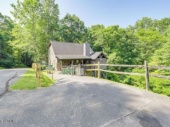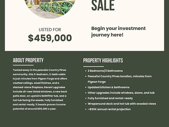 Tucked away in the peaceful Country Pines community, this 2-bedroom, 2-bath cabin offers a warm, inviting getaway just minutes from the heart of Pigeon Forge. The open living area features vaulted ceilings, wood finishes throughout, and a stacked-stone fireplace. Both bedrooms have queen-size beds and their own full baths, including an upstairs Bathfitter tub installed in 2024. The living room's sleeper sofa has an upgraded plush mattress, giving the cabin room for up to six guests. This turnkey property is ready to go—fully furnished and stocked so you can start renting right away. Upgrades include all-new tinted windows (including the large gable windows), a new back patio door, and durable Polywood chairs. Outside, you'll find a wraparound deck, a hot tub facing the woods, and peaceful wooded views. There's also extra storage space beneath the cabin. With easy paved-road access, proven rental income potential of around $50,000 a year, and plenty of thoughtful updates, this one is truly ready for its next chapter.