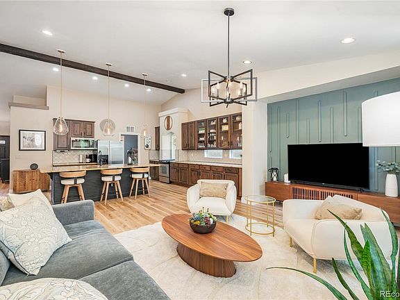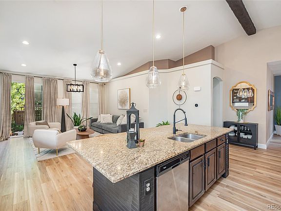 Welcome to this beautifully updated ranch-style home in the sought-after neighborhood in The Meadows! Step inside to stunning light flooring and high ceilings that create a bright and warm feel. Featuring 2 bedrooms, including a serene primary suite with an ensuite bath, this home blends comfort and style in every corner. The updated kitchen has custom cabinets with warm rich wood tones, a convenient pantry, a gas cooktop and large center island, perfect for gathering. The modern feel extends throughout the home with beautiful accent walls, stylish fixtures and updated lighting throughout. Enjoy hosting in the formal dining room (which used to be a bedroom and could easily be converted back to a bedroom) or relax in the inviting living spaces, plus a laundry room, all designed for effortless main-floor living. More opportunity awaits by adding additional living space in the unfinished basement. Step outside to your private backyard sanctuary, complete with a peaceful patio and lush landscaping, perfect for morning coffee or evening gatherings. The extended front porch enhances the curb appeal, welcoming guests with charm and character. Additional highlights include a 2-car garage and close proximity to parks, the community pool, scenic trails, and top-rated schools. Don't miss your opportunity to live in this move-in ready home!