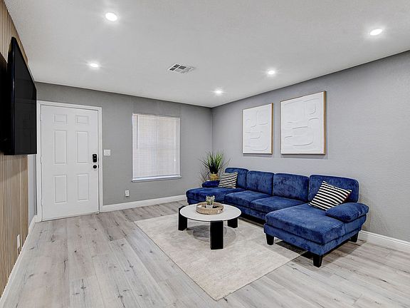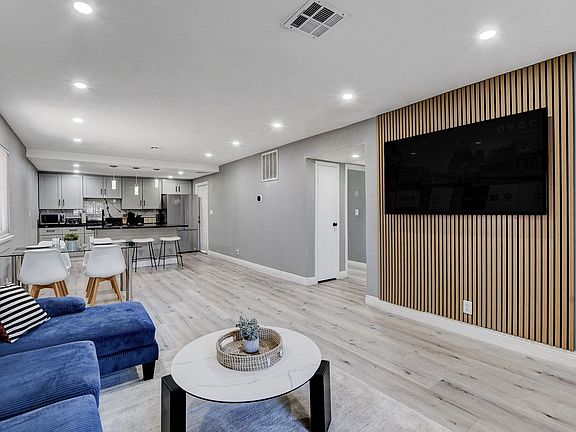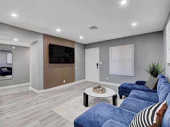Enjoy a spacious and inviting living room with a custom wood accent wall, mounted flat-screen TV, and large sectional perfect for cozy nights in or hosting guests. Natural light fills the room, creating a warm and welcoming atmosphere.