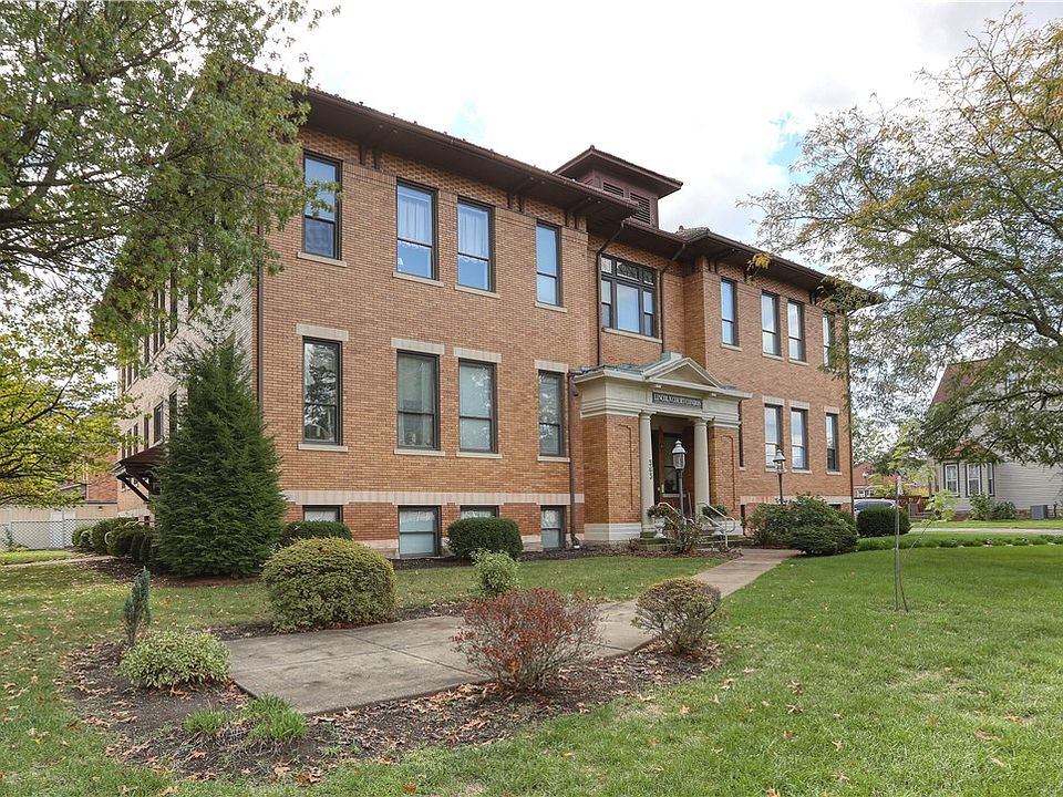 It's safety first in this secured building in the heart of historic Beaver. What was once a functional school building in the Beaver Area School District built in 1906, it now houses ten condos completed in 1989. High ceilings and large windows create a sense of spaciousness and enhance the overall living experience. The current owner painted each room and the cabinetry in 2021 and installed new flooring in many rooms. This is a first-floor unit with two bedrooms and two full baths. A new water heater was installed in 2023. Each unit has garage space for one vehicle and a storage unit (in the basement). An elevator is located in the lobby.