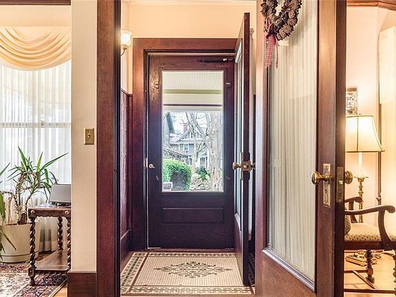 Historic "Calder-LeFevre" home. Built circa 1912 By newlyweds, Minnie & John Calder. Artist owned. First time on the market in decades. Rare. Exquisite details: enclosed vestibule w lincrusta lined walls & elaborate tile floor, Doric columns set off the living rm, pocket doors separate living rm & dining rm, iron-speckled brick fireplaces in living rm & bdrm, boxed beam ceiling in dining room, spectacular Edwardian era stained glass window, 3 fireplaces, 2 laundry chutes, massive open porch, so much more! Master bedroom has large private bath w separate tub & shower. Completely renovated eat-in kitchen with walk-in pantry. By appointment only. 24 hour notice for all appointments. Buyers must be accompanied by their real estate agent.