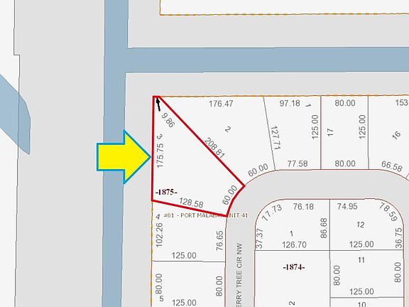 It's an oversized 0.39 acre buildable residential lot available in Port Malabar Unit 41 of Palm Bay! Located in the northwest section, this lot has a drainage canal in the rear allowing more privacy, and is just 1.8 miles - 6 minutes to Heritage High School, 3.8 miles - 10 minutes to the Winn Dixie Supermarket, 14.2 miles - 25 minutes to Melbourne Airport, and 16.7 miles - 36 minutes to the beaches of Indialantic. From exit #180 of I-95 go west on US-192 for .5 miles, left on St Johns Heritage Parkway for 6.1 miles, left on Malabar Road for .7 miles, left on Thunderbird Avenue for 4 miles, left on Virburnum Road for .1 mile, road turns right and becomes Cherry Tree. the lot will be on your left.