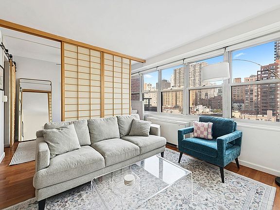 Beautifully renovated high-floor studio, thoughtfully converted into a one-bedroom, offering open city views in a prime Upper East Side location. The spacious, renovated kitchen features granite countertops, stainless steel appliances (including a dishwasher), and a breakfast bar with bar seating. The generous living area easily accommodates both living and dining furniture, while the large sleeping alcove has been expertly transformed into a bedroom with sliding doors—allowing for privacy or an open flow as desired. An updated bathroom and abundant closet space complete this inviting home, which is both quiet and bright, boasting five north-facing windows with sweeping city views.