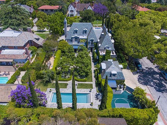 Sophisticated & Private French Country Trophy Estate designed by architect Stiles O Clements in 1939 , reimagined by Clements Design in 2016. This Home is situated in prime Hancock Park on an almost 20,000 sq ft flat lot. The home is set back from the street behind hedges opening to a large motor court . The front door opens into a formal entry with a sweeping circular staircase. High ceilings and generously proportioned rooms all lead to outdoor gardens, outdoor dining room, a pool and a guest house above the two car garage and a sport court. The first floor is comprised of a grand living room leads to a separate bar/lounge, formal dining room, an incredible chefs kitchen opening to a family room . The stunning master has ample custom closets, a master bath and a large balcony. There are two additional bedrooms, a third floor recreation room, and office area. The house is equipped with the finest fixtures, textiles, appliances and Crestron Smart Home system. This home is exquisite!