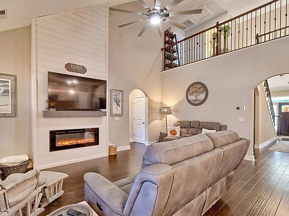 Cozy led fireplaceLarge kitchenStainless steel appliancesGrand staircaseOversized screened porchGas rangeHardwood floors