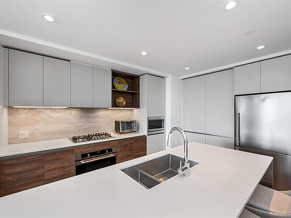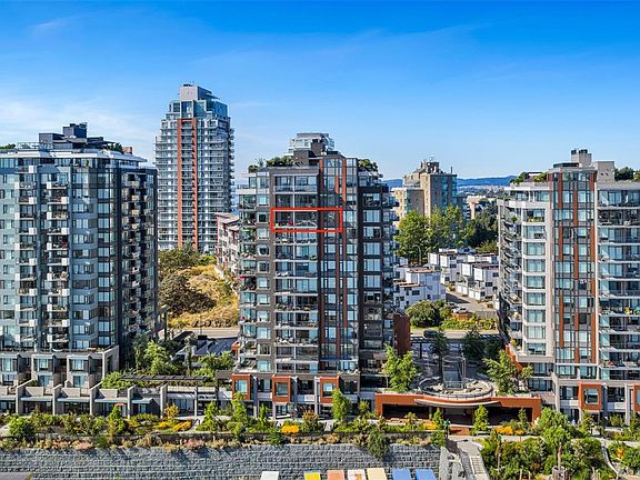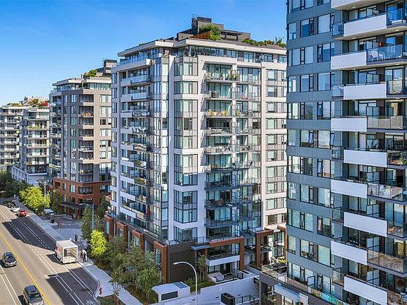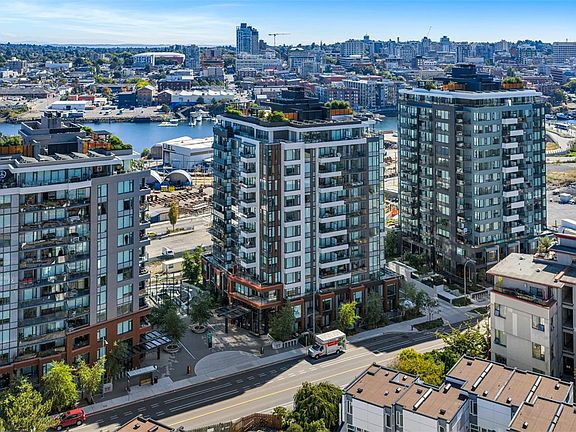 Perched on the 11th floor, this beautifully appointed 2 bed/2 bath home offers sweeping city, ocean & mountain views, enjoyed from both the expansive 179 sf. balcony & the bright, open interior. The open-concept layout is anchored by a chef-inspired kitchen featuring a quartz island, gas range & custom cabinetry, perfectly suited for everyday living & entertaining. The primary bedroom is a true retreat, complete w a walk-through closet, spa-inspired ensuite. A thoughtfully separated 2nd bedroom and full bath provide ideal flexibility for guests, family or a dedicated home office. Secure ug parking & a storage locker are included. At Dockside, the lifestyle is as compelling as the location, w curated amenities including a fitness centre w Peloton bikes, rooftop terrace with BBQs, residents’ lounge, pet wash station, bike storage. Step outside to the Galloping Goose, cafés, dining and downtown. Pet-friendly, rental-friendly, still under warranty, built by award-winning BOSA Development.