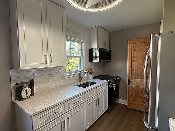 “Eat-in” Kitchen with extended uppers, quartz countertops, tile to the ceiling, and deep sink