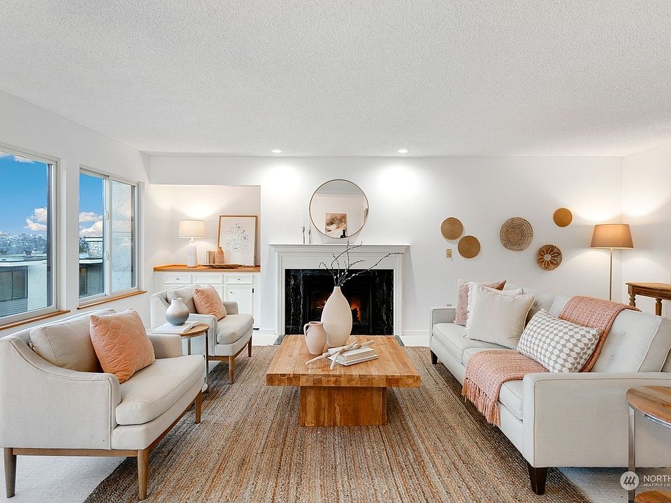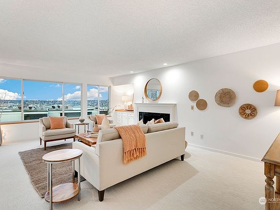 Iconic James Paul Jones condo rarely available. Incredible amount of square footage for a single level condo. Light and bright greets you as you enter this 2 bedroom, 2 bath condo. Refreshing alternative to multi-level, vertical townhouses. TWO parking spaces and TWO living rooms with a BONUS room & enclosed sunroom. Freshly painted and move-in ready. Enjoy East facing views and sunrises. Very well run HOA with lots of expenses covered by dues. New clubhouse and exercise facility with outdoor pool for Summer fun! Storage galore inside the unit as well as a huge storage closet in the secure and private garage space big enough for two cars. This location is close to bus transit, dog parks, walking trails and Fisherman's Terminal.