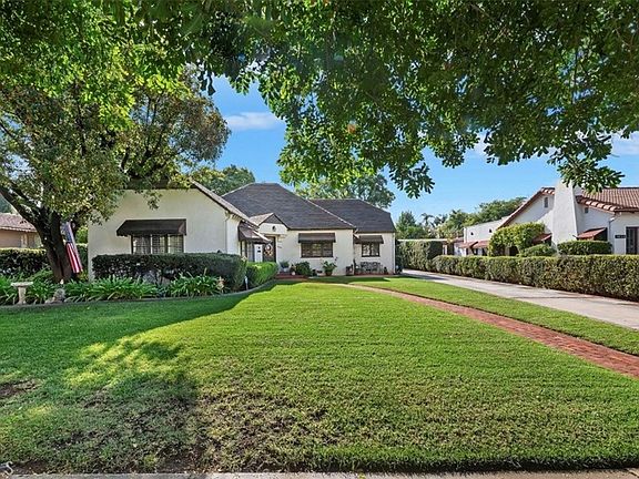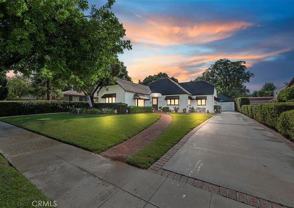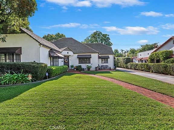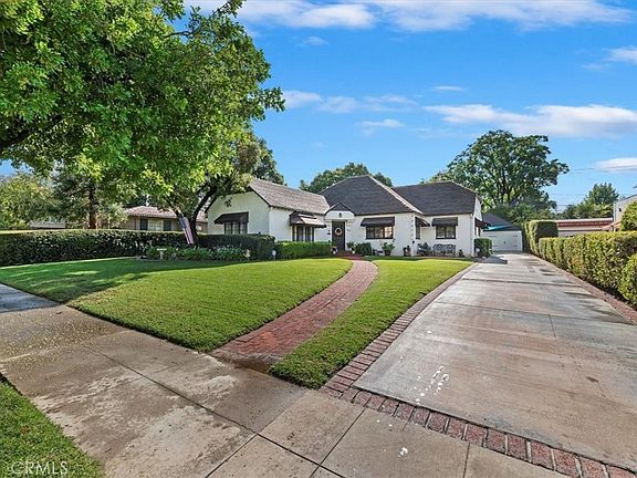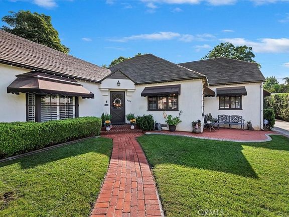 RARE FIND***Three bedrooms, plus den (could be fourth bedroom), three bathrooms***Discover this quintessential Tudor-style home nestled in the heart of Riverside’s historic Wood Streets neighborhood. This storybook residence perfectly blends timeless architectural charm with tasteful updates, making it a truly rare find. From the moment you arrive, the home’s curb appeal captivates—with its steep gables, custom canvas awnings, mature landscaping, and classic brick walkway leading to the inviting entryway. Inside, you’ll find a spacious layout filled with character and natural light. The formal living room features stunning picture windows, plantation shutters, original hardwood floors, and a wood-burning fireplace framed by custom built-ins. The formal dining room, adorned with its original brass chandelier and sconces, creates an elegant space for entertaining. The kitchen has been beautifully refreshed while maintaining its vintage charm, offering plenty of cabinet space, tile counters, and direct access to the family room—a cozy, light-filled space with built-in bookshelves, a desk area, and access to the serene backyard. Three well-proportioned bedrooms offer flexibility, including two oversized rooms that can serve as dual primary suites, and a third conveniently located near its own bathroom—ideal for guests or extended family. All three bathrooms have been tastefully updated, combining modern convenience with period-inspired details. Downstairs, a rare finished basement provides extra storage or hobby space, while the oversized detached two-car garage offers additional storage and workshop potential. The .22-acre lot is beautifully landscaped with rose bushes, magnolia and citrus trees, and a private backyard retreat ideal for relaxing or entertaining. This home has proudly been recognized as a City Structure of Merit and was once featured on the Riverside Panhellenic Home Tour—a true testament to its historic and architectural significance. With new flooring, fresh paint, copper plumbing in the main bath, and the enduring beauty of its original craftsmanship. 3630 Castle Reagh Place is a unique find with updated finishes while maintaining classic 1930s character.