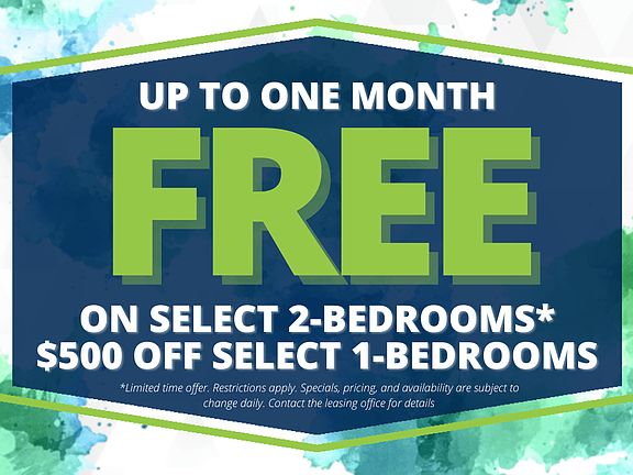 - Special offer! Up to One Month Free on select 2-bedroom homes and up to $500 off select 1-bedroom homes! *Limited time offer. Restrictions apply. Specials, pricing, and availability are subject to change daily. Contact the leasing office for details