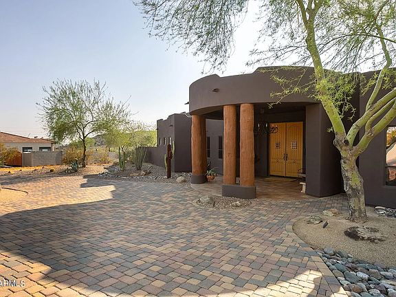 Exquisitely appointed custom home designed by award winning architect on 1.25 acre elevated view lot. Countless upgrades w/absolute attention to every detail make this a one-of-a-kind property. 3 master-size suites w/private luxurious baths, hot tub, 12 foot wood entry doors, 16 foot soaring ceilings, natural log vigas, stone floors, 3 fireplaces & so much more! 1700+ SqFt CLIMATE controlled 5.5-6 car garage w/office makes this a car collector or hobbyists dream space. Outside features curved paver driveway, built-in BBQ, gas fireplace, expansive covered patio, synthetic grass, cascading fountain & endless views. Tiled portion of garage with direct hot tub access can be used as an office or wet room.