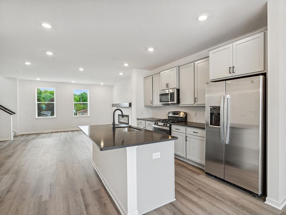 Upstairs you will find all three bedrooms. The large owner’s suite offers a generous-sized walk-in closet and en-suite bathroom that features a quartz countertop and dual sinks. 2 more bedrooms and a full bathroom are also on this level.