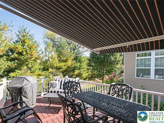 Experience easy living in this elegant ranch-style home featuring a fully finished lower level with a full bath. The open-concept great room offers surround sound. Also included is a two-sided gas fireplace shared with the bright sunroom, which showcases a wall of windows and a sliding glass door leading to the expanded, covered Trex deck. Enjoy outdoor living with steps down to the backyard and a walking path, plus a gas line for your grill and a large retractable awning.