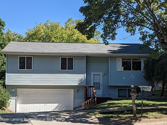 Great location, close to the new McLaren Hospital, University Club, and MSU. Enter into the 2-story foyer with ceramic tile with stairs down to lower level/ over-sized 2 car garage and stairs up to main living area. Living room is large and open to kitchen (with updated appliances) and dining with slider to deck. Largest primary/bedroom overlooks the rear yard. Front bedroom is used as office and 3rd bedroom at the end of the hall sons room. Main hall bath has separate sink area from stool and tub/shower combo. Lower level has half bath and large family room and laundry. Nature views in back.