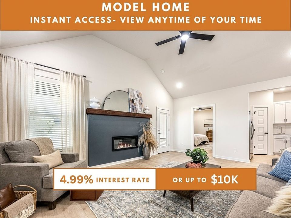 MODEL HOME that perfectly showcases the style, quality, and luxurious features you can expect in your dream home. Fence, blinds and gutters included! Discover your dream home in the new neighborhood- Jacob's Crossing. Caden plan with 1 level, garage on the right & West facing! 13 ft ceilings in the living and dining, linear electric fireplace, LVP flooring throughout the main living areas & primary bedroom, quartz countertops & more. Chef's kitchen boasting frigidaire stainless steel appliances, gas range, pantry, quartz countertops, bar pull handles, large island & gorgeous backsplash. Luxurious primary bedroom features abundant natural light, while the spa-like primary bathroom offers a walk-in shower, double sinks, tub & spacious walk-in closets. Additional features include two large secondary bedrooms & a functional laundry room. Nestled on a generous lot with covered patio that overlooks the sodded, fully fenced backyard. Sturdy concrete siding and brick!