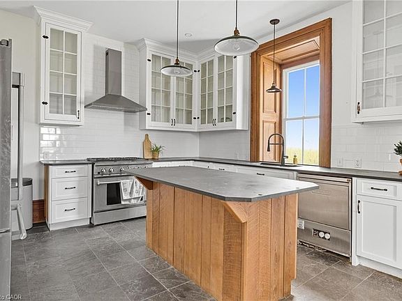 Step back in time and experience the magic of this 1800s fieldstone century home—where history and modern craftsmanship blend into something truly extraordinary. Lovingly restored from the studs up, every detail of this home has been carefully reimagined to honour its past while embracing the comforts of today. The heart of the home is its sun-drenched main floor, where 12-inch pine flooring, oversized baseboards, and deep windowsills frame the charm of each room. The kitchen is as functional as it is enchanting, featuring slate countertops, repurposed sunroom windows transformed into cabinetry, a six-burner gas oven, and an industrial dishwasher designed for effortless entertaining. A clawfoot tub, copper sink, and exposed stone wall bring timeless character to the main-floor bathroom, while the formal dining room, elegant staircase, living room and a main-level bedroom complete this inviting space. Upstairs, four generous bedrooms unfold, along with a three-piece bath in one of the bedrooms for convenience, another three-piece bath plus laundry extend into the addition of the home, and a bonus skylit retreat—perfect as an office, studio, or reading nook. The attic and dual basements offer endless potential to add finish space to the home, with one basement boasting a walkout to the yard. Outside, the story continues across just over an acre of land. A wraparound porch offers sweeping views of the surrounding cornfields, where the colours of every season paint the perfect backdrop. A charming greenhouse waits at the back, ready for new life to flourish. A rare blend of history, heart, and possibility—this one-of-a-kind century home is ready for its next chapter.