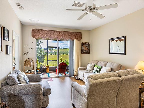 Heritage Hills is a sought after 55 plus community located in beautiful Clermont! Perfect location to walk to the clubhouse!! Beautiful lot with no rear neighbors! This St. Lucia model is very popular with 2 bedrooms and 2 bathrooms plus a flex room! Wait until you see this view in the backyard! You will enjoy relaxing on the screened lanai and take in the view! Upgrades include gutters in the back, a glass/screen front storm door, both windows were replaced and are high wind impact resistant. The carpet in the main living area was replaced with luxury vinyl plank flooring, new ceiling fans installed in the bedrooms and all appliances stay including the washer and dryer! Seller is offering a one year home warranty! The kitchen features two pantry's, granite countertops and breakfast bar! The floor plan is perfect for entertaining! The flex room works as an office, sitting area, craft room, etc. Lots of possibilities! The property is located close to the clubhouse for convenience! Heritage Hills amenities include a heated pool and spa, pickle ball, tennis, basketball, bocce ball, shuffleboard, clubhouse with planned activities, lots of clubs to join, fitness center, art and crafts room, billiard room, card room and ballroom for holding events. Exterior is painted every 5-6 years! The roof is replaced at year 15 and the reclaimed irrigation water is included in the HOA fee. There is a 5 mile walking trail around the community. Call today for a private showing!