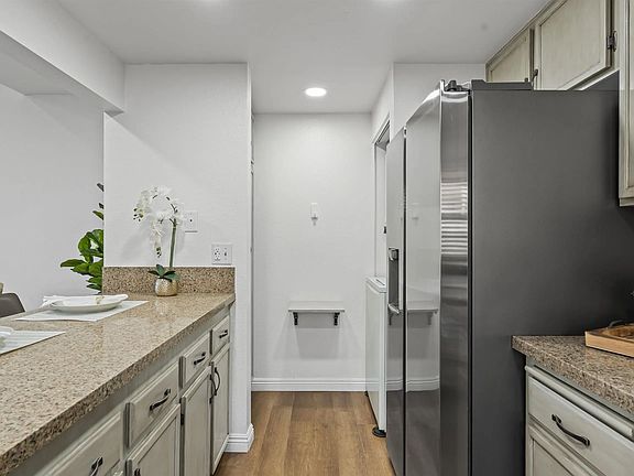 Welcome to Avocado Village Ct # 140. Situated in a serene community - this top level corner condo offers privacy and scenic hillside views. Features include vaulted ceilings, fireplace, in unit laundry, A/C, updated flooring and new recessed lighting. The kitchen offers modern appliances that were updated this year. Enjoy the private patio with stunning views and large glass slideres from both the primary bedroom and living room. Just a few steps away from your 1 car garage with ample storage and shelves. And an additional dedicated parking spot located near the unit. Enjoy the well maintained walking paths and community pool & spa. Located near parks, shopping, dining and major freeways. HOA covers water and trash.
