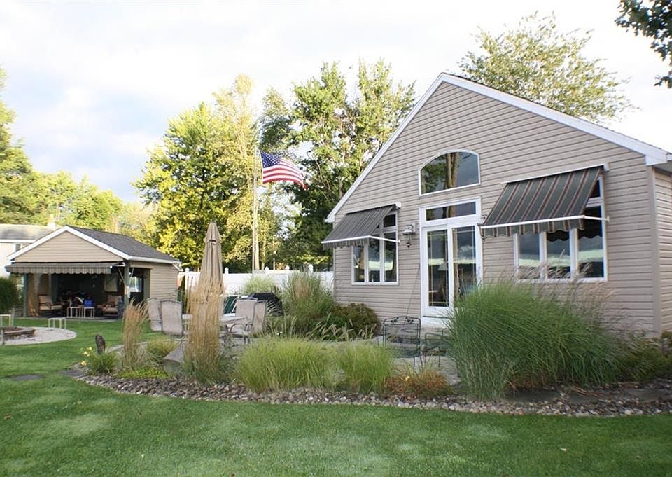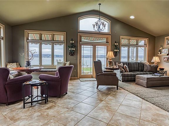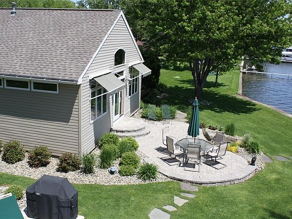 This Two-story home has 5 bedrooms, 3 ½ baths, a large kitchen, dining room, first-floor laundry room and a lakeside great room with stunning lake views on the waters' edge. In 2018, a new Weil-Mclain boiler with 3 zones, a new hot water tank& 200 AMP electric service has all been installed. In 2019 a new well and water treatment system was installed. Across the street, is a 2 story, 2 car insulated garage with natural gas heat. It sits on an additional 100' lot. Parking for 12 cars and room for covered boat and trailer storage. This home is beautifully landscaped and is located on a very private dead-end road. The lakeside of the home has a stone patio and a large deck. It also has a large entertainment area with pavers surrounding a huge fire pit and a 16 x 20 structure. Aluminum dock
