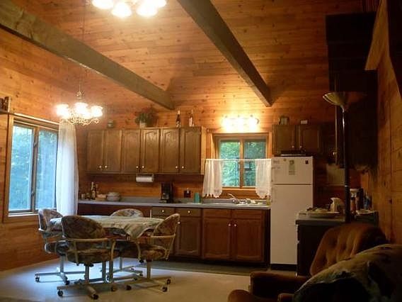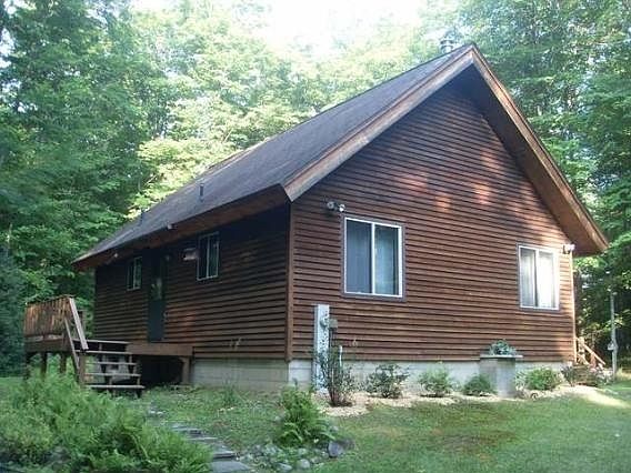 Here's a well designed 2 bedroom, 2 bath year round home in a sunlit clearing on over 5 acres with towering maples. It offers cathedral ceilings and loft, open concept, wood burning stove, full basement, decks, detached garage and a handy storage shed. Enjoy a peaceful setting, relaxing nights at the fire pit and woodland views in every direction. This chalet is in an area of year round recreational opportunities and is an excellent choice for your home or hunting cabin.