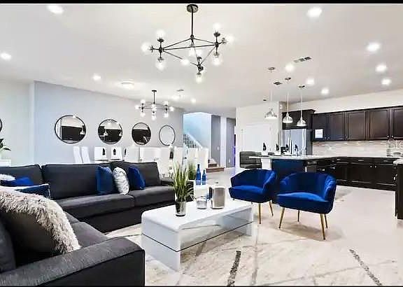 Welcome to this stunning 10-bedroom, 8-bath, fully furnished vacation home with private pool and spa, located in the highly sought-after gated community of Windsor Island Resort! The two-car garage has been converted into a game room with insulation and AC/heater installed. With accommodations for up to 24 guests, this home is perfect for the ultimate vacation experience. This 24-hour guard-gated community has its own amenities such as a Clubhouse with Fitness Center, Tennis court, Basketball court, Arcade center, Community playground, Resort-style pool, Lazy river & spa, Splash pad, miniature golf course, and On-site Tavern and Grill to entertain all your future guests, friends, or family.