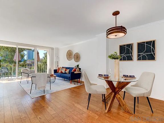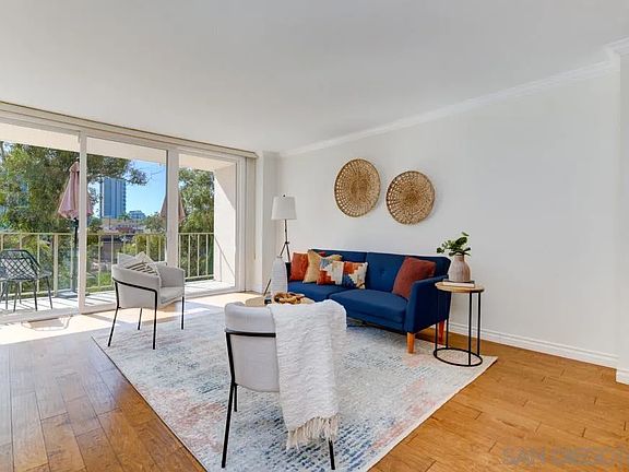 Fabulous 4th floor corner unit at Coral Tree. South-facing residence looks directly into Balboa Park. Beautifully upgraded and freshly painted, this open-concept floor plan is light & bright, spacious & ready to call your new home. Kitchen opens to living area. Floor to ceiling window & slider to large balcony that overlooks the canyon & trees. 2 full bathrooms, Brilliant hardwood floors, crown-molding, Washer/Dryer in unit, Full HVAC throughout & plenty of storage. Walk-in closets in both bedrooms. 2 side-by-side spaces in secure parking garage & storage closet. only 4 other residences share the same floor! Coral Tree offers a tremendous level of amenities and is centrally located to all that San Diego has to offer.