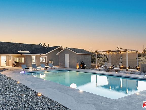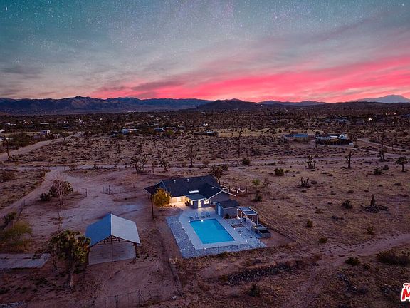 Generating $80,000 in annual gross income, this fully furnished, turnkey 5-bedroom, retreat delivers exceptional short-term rental performance and high-desert luxury. Set on five private acres in Yucca Mesa, the 2,040 sq ft home has been fully remodeled with designer finishes, including luxury vinyl plank flooring, recessed lighting, and a modern kitchen with a new cooktop, Samsung Bespoke refrigerator, shaker cabinetry, and butler's pantry. The open-concept layout is bright and spacious, ideal for entertaining. The primary suite features a spa-inspired en-suite bath, while a fifth bedroom in the pool house offers a private entrance for guests or rental flexibility. Outdoors, enjoy a resort-style setting with an Olympic-sized pool, hot tub, firepit, hammocks, and a custom Linx patio cover, all surrounded by sweeping desert and mountain views. Additional features include RV hookups, 220V carport, a storage unit, and a custom enclosed area suitable for events or parking. With HV/RL zoning, and room to expand, this property offers both immediate cash flow and long-term growth potential just minutes from Joshua Tree National Park and Pioneertown.
