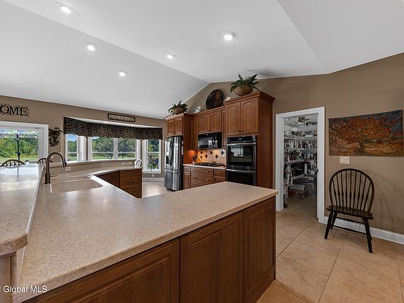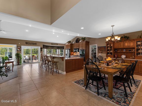 Your sensational custom ranch home is your private park. Built w/top of the line materials, & unique attention to detail. Set on 11 acres your home has impressive landscaping, a beautiful view, a stocked pond, a driving range, & 2 waterfalls in front. This home spans 3,000 sqft w/ 3BR, 2BA & living space for every need & season. The open chef's kitchen sports a huge breakfast bar & faces a living rm w/fireplace & natural stone surround. Double-height ceilings, recessed lighting, windows galore to show off views in all directions. A 4-season rm w/ zoned heating is winged configuration delivers a private rear deck. A 2500 sqft plumbed full basement, 3 zoned heat & central air, manicured lawn & pond: It's comfortable as it is beautiful. Stone facade & columns make for sensational curb appeal.