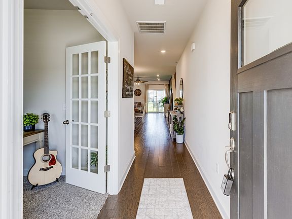 This gorgeous home has everything you could want. It has 4 large bedrooms and a dedicated office that could be a 2nd bedroom on main floor if a 5th bedroom is needed. It has a large primary suite on main level as well as first floor laundry. It is full of hardwood floors, quartz countertops, with lots of natural sunlight throughout. The second level has a second large suite and a second full bath to accommodate the 2 remaining bedrooms on the second floor. It has a large bonus room that is great for entertaining. The back of the home has a covered patio that gives you direct access to the beautiful private pond. You are able to kayak, fish, or even take out a small boat. The neighborhood also offers walking trails throughout and has a playground for children.