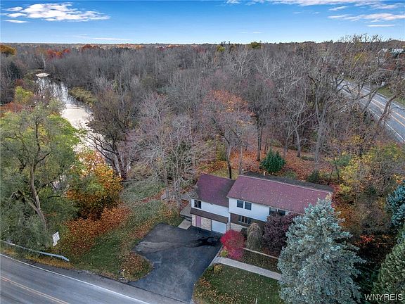 Welcome to this serene split level home sitting on just over 3 acres. Outside you will find a very spacious front and back yard with beautiful landscaping, a shed for storage, lush foliage, and a large back porch with a cozy view of Ellicott Creek. Walking into the first floor of the house you will find an office, a large living room, a full sized kitchen and dining room, as well as a full sized bathroom and bedroom. Moving up to the second floor you will find a second office, another full sized bathroom, and 4 total bedrooms including a master bedroom with lots of closet space. Also attached to the master bedroom is a hidden storage room. Additionally there is an attached one car garage and separate work shop space.