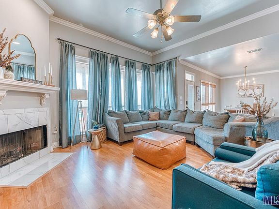 Welcome Home! This absolutely beautiful 4-bedroom, 3-full-bath home is nestled on a quiet street in the popular Easterly Lakes Subdivision in Watson. This home features a semi-open floor plan, a corner wood burning fireplace, recessed lighting, crown molding, beautiful laminate wood flooring, and a bright interior. The living room has a wall of windows for plenty of natural lighting. The kitchen offers freshly painted upper white & lower navy custom-built cabinetry with an abundance of storage space, new stainless steel appliances, new quartz countertops, and a raised breakfast bar. The bedrooms are all spacious, and the master bath features double vanities, a large soaking tub, a separate shower. You will love your evenings outdoors under the extended covered patio with views of the lake and well-manicured backyard with beautiful palm trees, and a saltwater swimming pool.