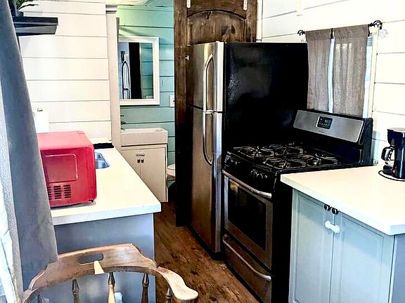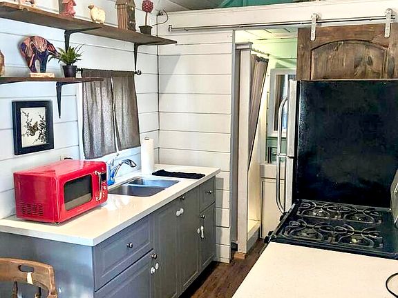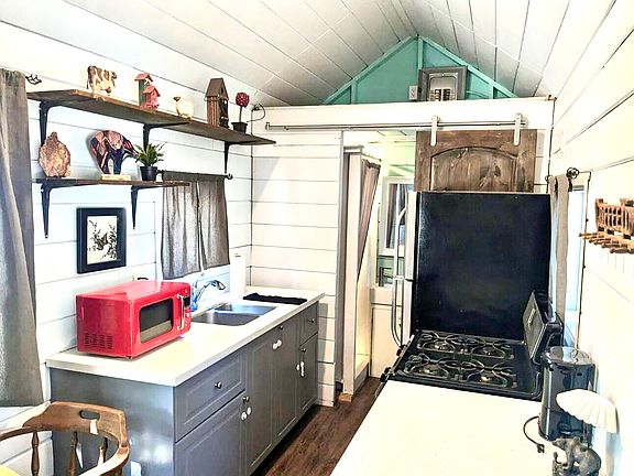This gorgeous tiny house boasts a downstairs living area plus a bedroom loft, kitchen, and bathroom. You'll love our beautiful mountains, fresh air, and peaceful environment.