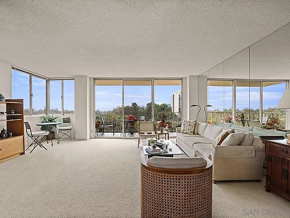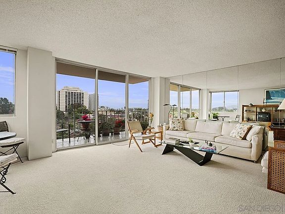 Experience sophisticated city living with unparalleled views in this perfectly placed southeast corner unit at Coral Tree Plaza! Perched on the 8th floor, this condo unveils a vast open living space that extends to an oversized balcony offering sweeping treetop vistas. Scores of windows flood the entire unit with that trademark San Diego natural light. The kitchen is equipped with granite surfaces, a convenient eat-at bar with recessed lighting, and is adjoined by a dining area, perfect for effortless entertaining. The generously sized primary bedroom suite boasts a walk-in closet, dual vanity, and step-in shower. With a sizable second bedroom, abundant storage including a storage space, and two secured parking spaces, this condo home provides a blank canvas for your creative Uptown vision! 3rd bedroom has been opened up and is currently being used as an den/office.