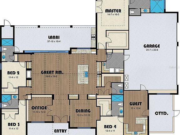 Large seated islandIsland kitchenQuartz countersTextured lanai and porchHigh ceilingsFrench doorsOpen floor plan