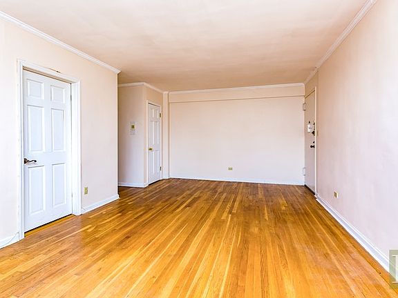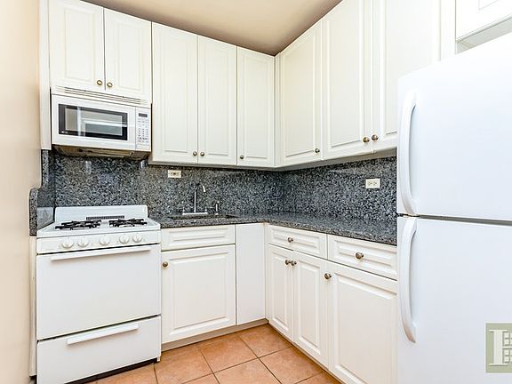 This converted alcove studio (Jr 1-bedroom) apartment has been renovated with a door separating the living room from a bedroom/bath suite. The kitchen has microwave and dishwasher, white cabinetry, stone counter tops and back splash with a silver glint of mica in the stone. There are hall and bedroom closets. The renovated bath is done in sand-colored tile, with stone counter at the sink. The walls are off-white with contrasting white door frames and moldings, and floors are hardwood. Views are open, over the roofs of Riverdale Avenue shops toward a hillside. The building offers gym room, private outdoor courtyard and rental storage units. Express and local buses stop just across the street, and there is a choice of shops and fine local restaurants within one block. OK to purchase as pied-a-terre.